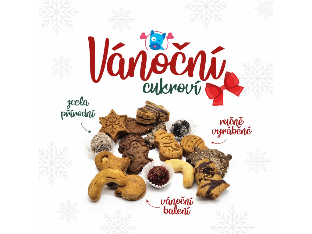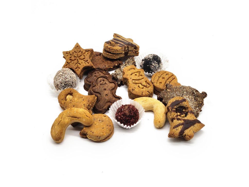 Vánoční cukroví - mix ručně vyráběných českých pamlsků pro psy ve vánočním stylu a zabalené ve vánoční krabici.